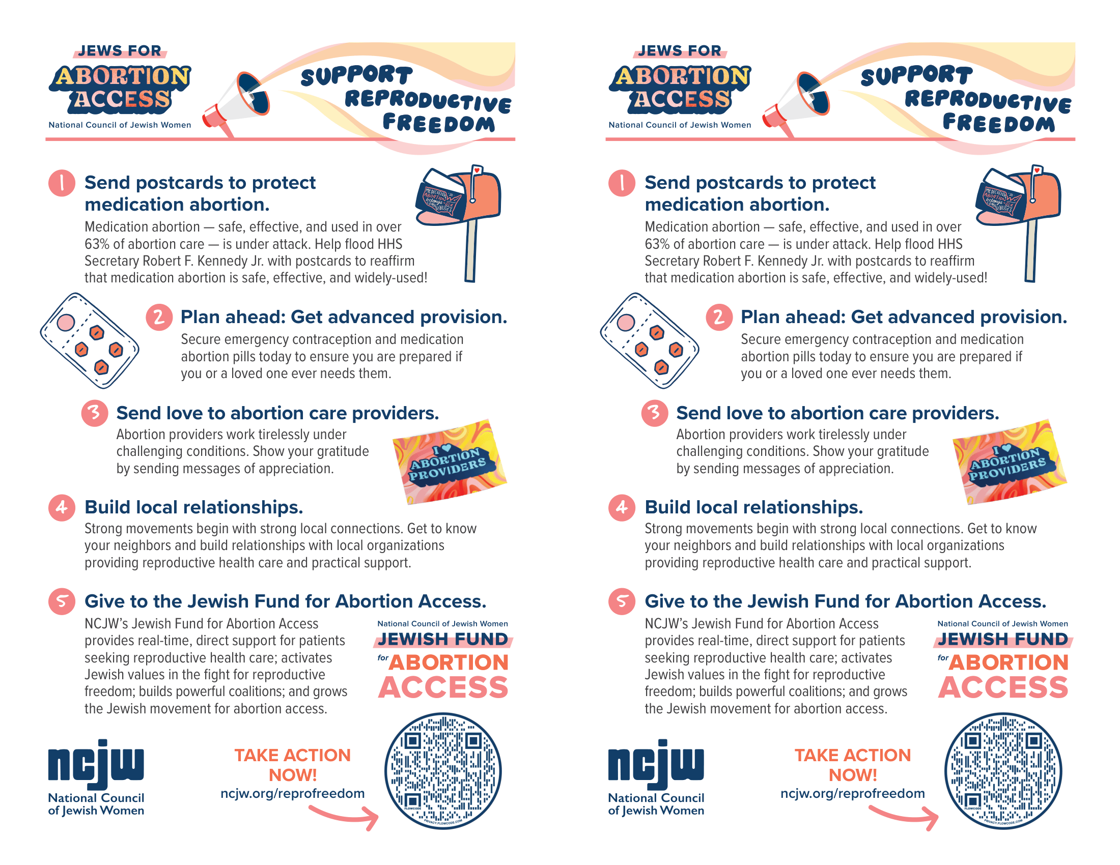 Want to give your communities ways to act after Repro Shabbat? Download this PDF with 5 ways to take action following Repro Shabbat. Just print and cut it in half to hand out to your Repro Shabbat participants! Or download the single-page version for easy digital sharing.